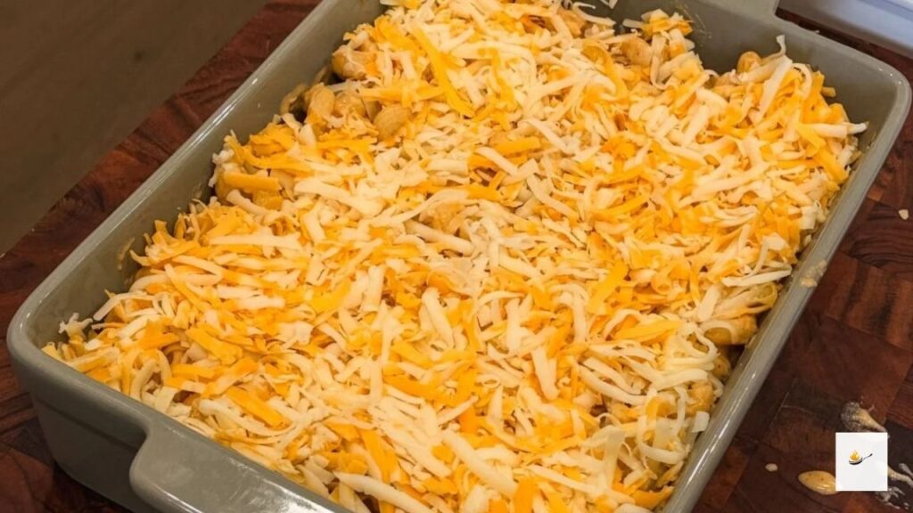 Transfer half of the mac and cheese to a casserole dish (I’m using a 7×11-inch dish) and layer with additional shredded cheese.
