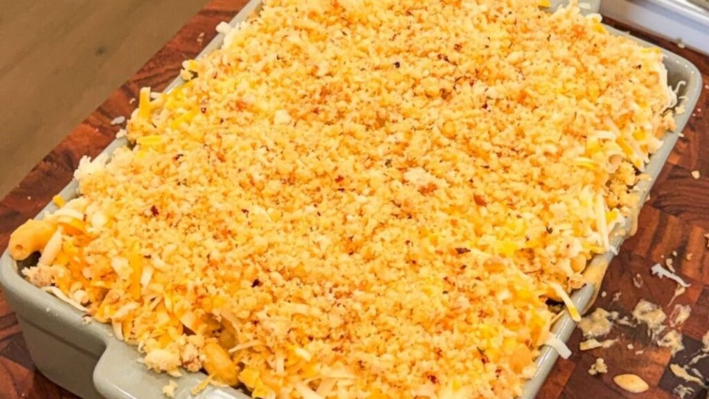 Repeat with the remaining mac and cheese and shredded cheese layer, then finish with the breadcrumb topping.