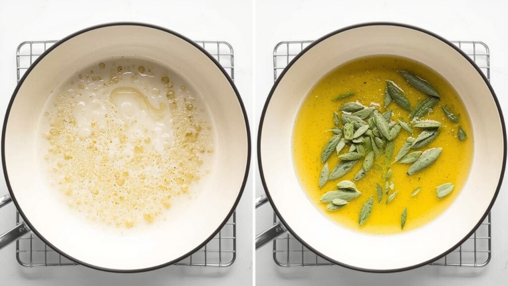Add the Sage: Add the chopped sage leaves to the brown butter sauce and let them sizzle for about a minute. At this point sauce will start to get fragrant.