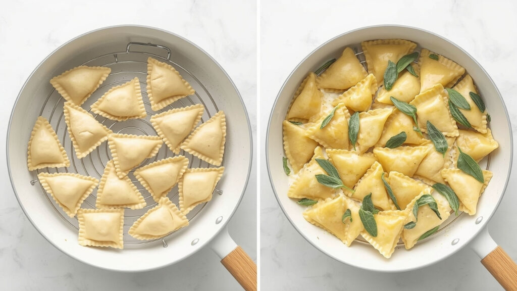 Cook the Ravioli: Boil your butternut squash ravioli al dente or according to the package directions. Reserve about ½ cup of the pasta water before draining all; this is liquid gold for your sauce.