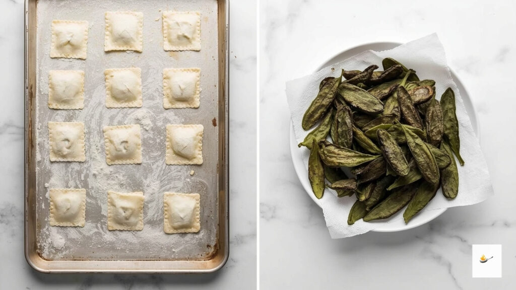 Bring a large pot of water to a boil and cook the ravioli in batches; soon they’ll start floating when they’re done. Lift them out with a slotted spoon and drain thoroughly on a paper towel.