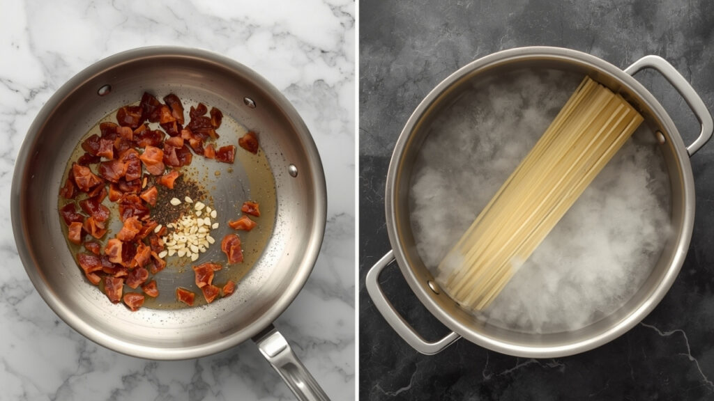 Before draining, scoop out at least 1–2 cups of hot pasta water, then drain the pasta and immediately add it to the skillet with the bacon. Turn the heat to medium-high and toss for 1–2 minutes so the pasta absorbs flavor.