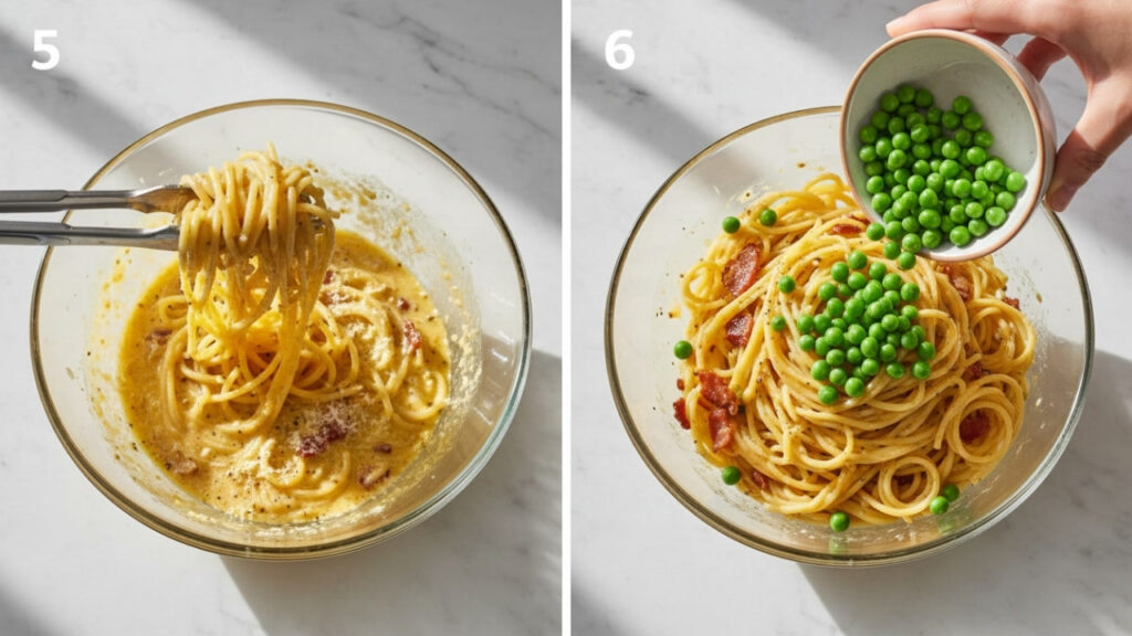 - Use room-temperature eggs and peas to avoid cooling the pasta too quickly.